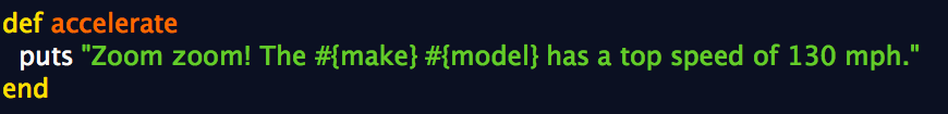 Now let's make this car move! Let’s start by making an instance method called "accelerate"! An instance method is a method that can only be called on an object from the class in which it is defined.